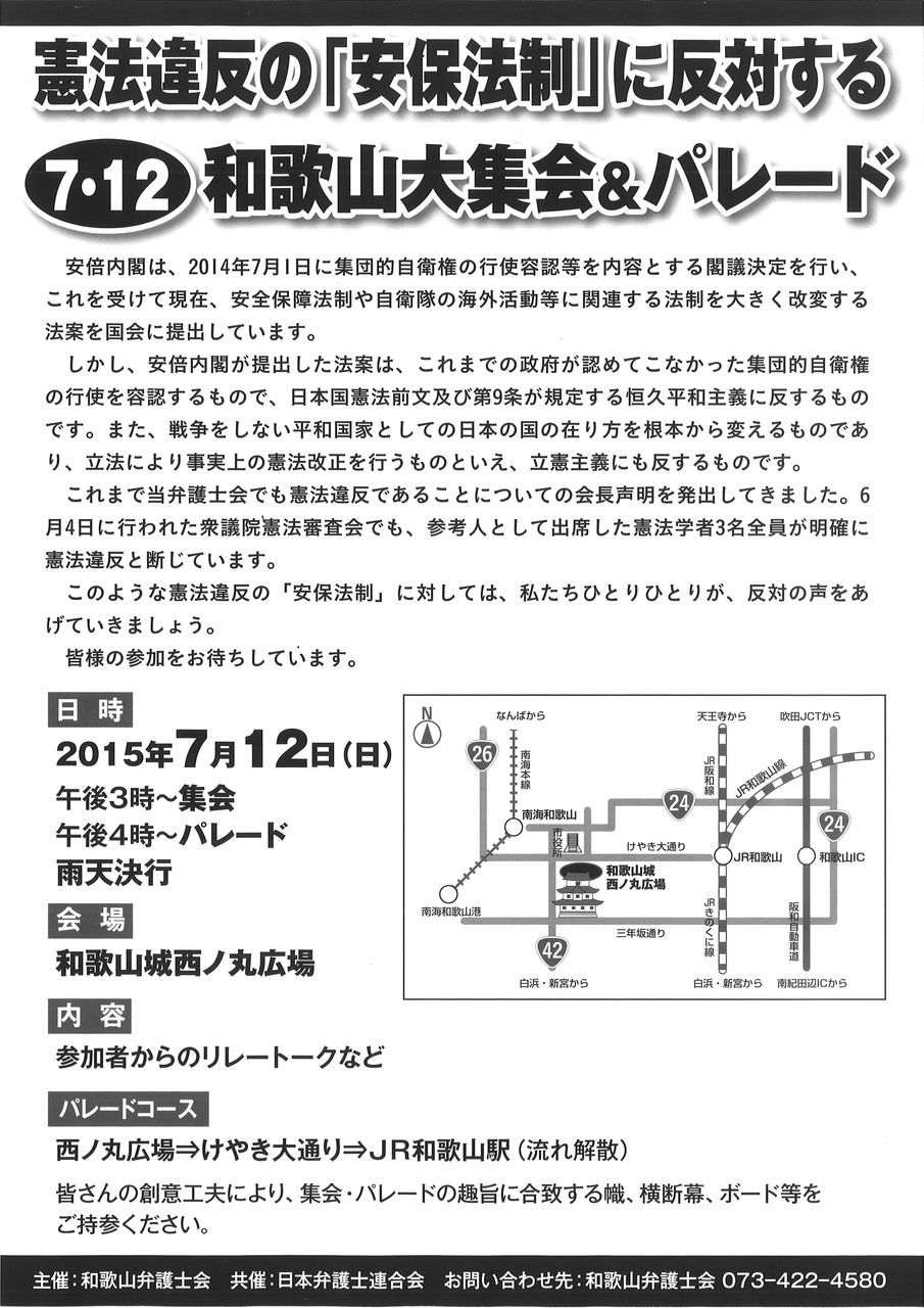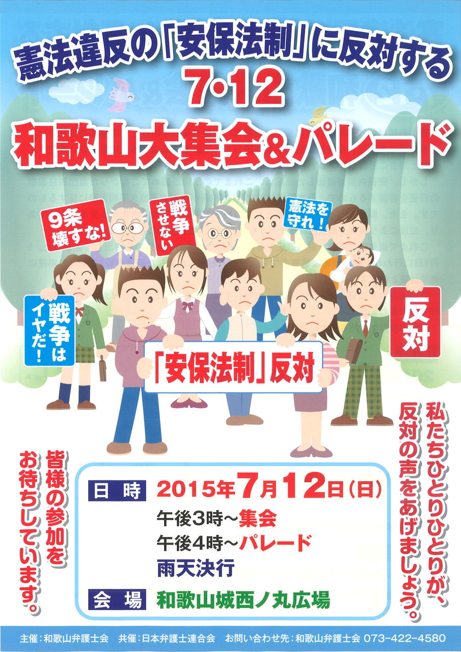 今日(7月13日)は新聞休刊日ということで、残念ながら、昨日、和歌山弁護士会が主催した「憲法違反の「安保法制」に反対する7・12和歌山大集会&パレード」を報じた新聞が届くことはありませんでした。まあ、全国紙については、明日の朝刊に期待するとしても、地元メディアの報じ方(というか報じない状況)には一言しておくべきでしょう。