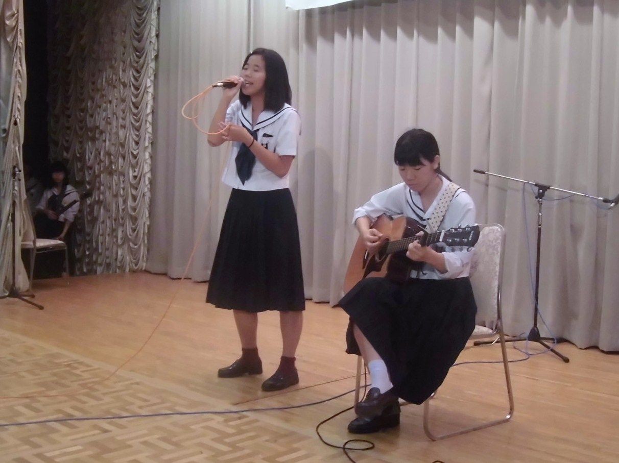 ところで、私は、彼女たちの演奏を聴きながら、来年の憲法記念日に西の丸広場のステージ(「Happy Birthday 憲法 in Wakayama」の3回目をやるとすればの話ですが)に星林高校軽音楽部を招待する可能性について思いをめぐらしていました(もしかしたら花田惠子さんも?)。星林高校は、憲法記念日イベントのステージディレクターをお願いしている花光郁さん(和歌山音楽愛好会フォルテ)の母校でもありますしね。ただ、今日のステージのままでの出演というのは「少ししんどい」ので、アコースティックバンドを結成して練習を重ねてもらうことはできないだろうか?などと勝手な夢想をしたりしました。そうすれば、ロックバンド主体の粉河高校軽音楽部(2年連続して「Happy Birthday 憲法 in Wakayama」に出演)と対照的で良いと思うのですが。・・・とFBに書いたところ、花田惠子さんから「可愛い女子高生たちに是非出演してほしいです~?」というコメントが。これは、真剣に出演交渉を考えた方がいいかな。