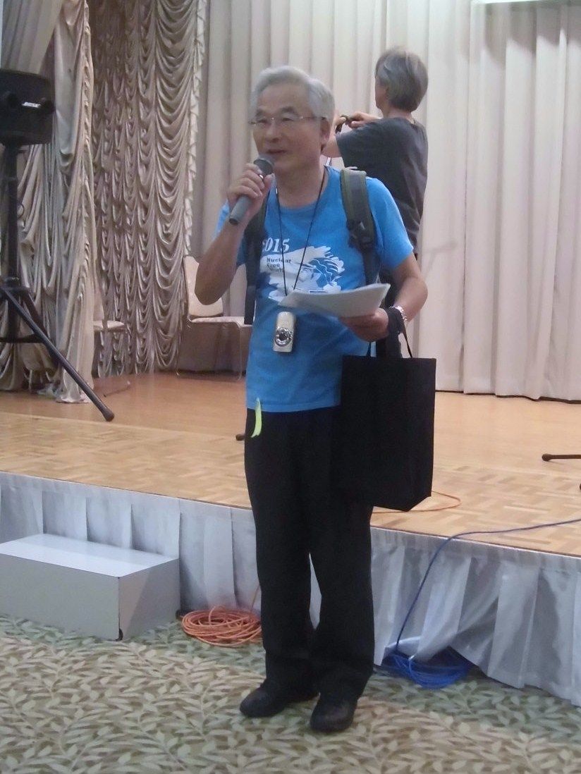 午後1時半から4階ホールで始まったピースライブのトップを務めたのは「五十五万石」の皆さんでした。今年の3月8日、和歌山城西の丸広場(フクシマを忘れない!原発ゼロへ 和歌山アクション2015)での衝撃的なデビューから5ヶ月近く、私にとって2回目の「五十五万石」の演奏でした。2回目にして「前を向いて歩こう」(「上を向いて歩こう」の替え歌)の歌詞はほぼ一緒に口ずさめる程度には憶えましたよ。実力派シンガー歌舞さん(にしでいづみさん)をサポートするお2人は、誰とは言いませんが(FBでタグ付しているから言っているのも同然?)、多忙のあまり、当日まで音合わせ(練習)が全然できないという弱点は随所に露呈しつつも、息の合った演奏ぶりで堪能させてくれました。是非今後とも様々な箇所で活躍されますようお祈りします。