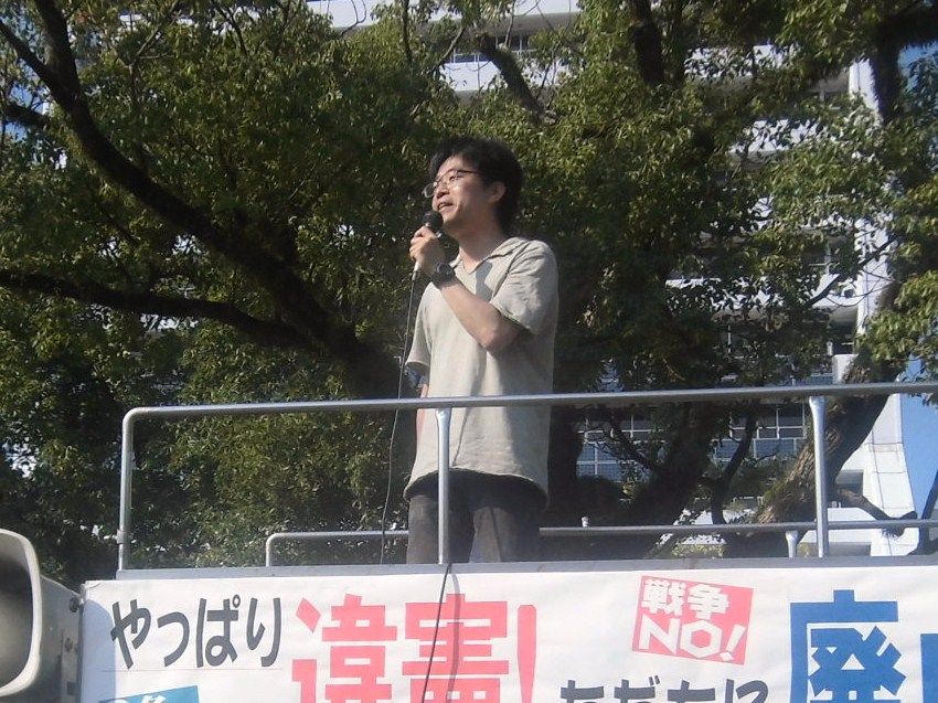 9・23集会のフォトアルバムによるレポート、続いてはリレートークの9人目(ラスト)、「安全保障関連法案の廃案を求める和歌山大学有志の会」の越野章史事務局長(教育学部准教授)です。8月13日の和大有志の会の結成、翌日の記者発表から始まった越野先生の「怒濤の日々」は、まことに目覚ましいというか、常軌を逸しているというか、大変なものだったと推測します。この間、私もあちこちの反安保法案イベントに極力参加するようにしてきましたが、その現場の多くで越野先生にお目にかかりましたし、私がせいぜい田辺のイベントに出演した程度であったのに、越野先生は複数回にわたって年休をとって東京での学者の会のイベントや国会前の抗議行動に参加してきたのですから、その大変さのレベルは桁違いです。今日の開会前にも、「9月中に書かなければならない本があるのに全然無理」と嘆いておられました。 なお、越野先生の前に、8人目のリレートーク話者として、和歌山大学3回生の男子学生がスピーチしてくれました。非常にしっかりとした意見を持ち、行動に移してくれる若者が地元和歌山の大学にいるということには勇気づけられました。ただ、「匿名希望」ということでしたので、写真の掲載は見合わせました。