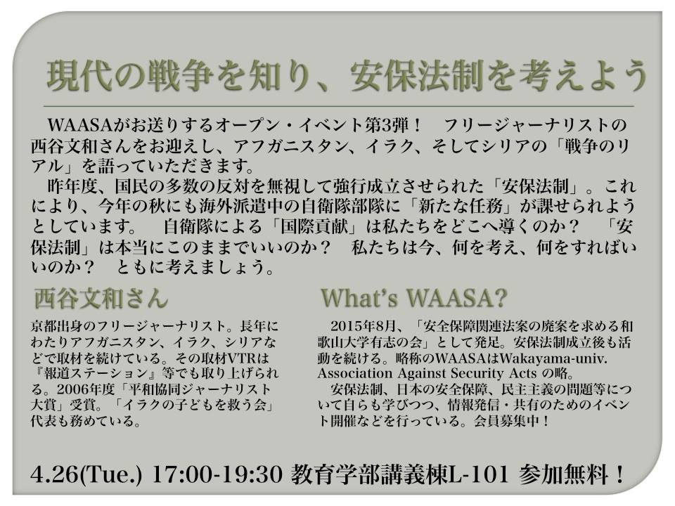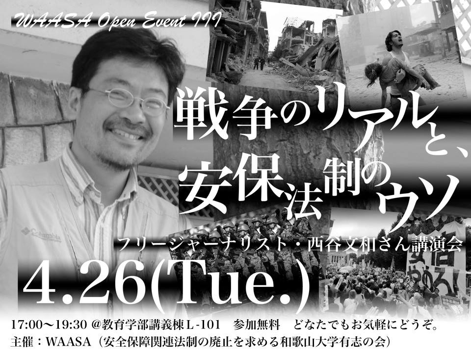 予告4/26西谷文和さん講演会「戦争のリアルと、安保法制のウソ」@和歌山大学~WAASAオープンイベント第3弾