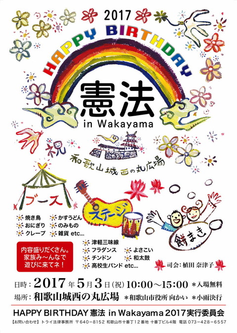 私の地元・和歌山では、2014年以来、憲法記念日に和歌山城西の丸広場を会場として開催してきたイベントを、“HAPPY BIRTHDAY 憲法 in Wakayama 2017”として今年も開催します。